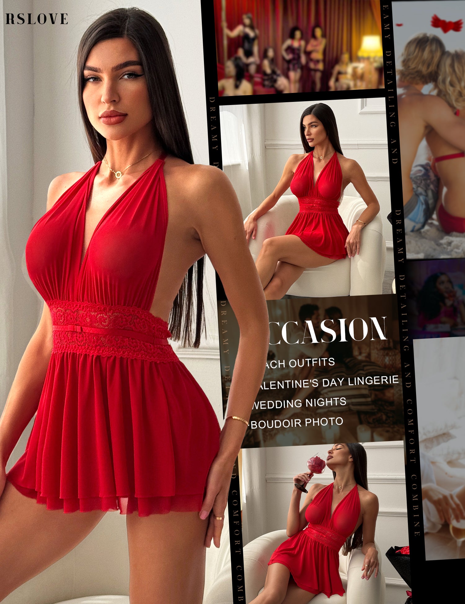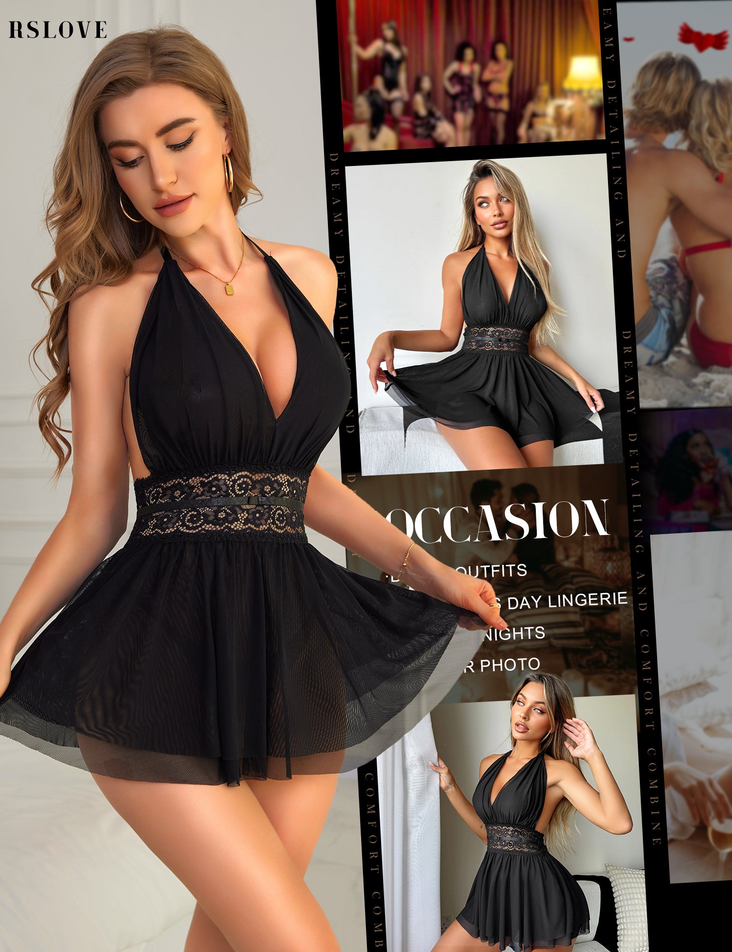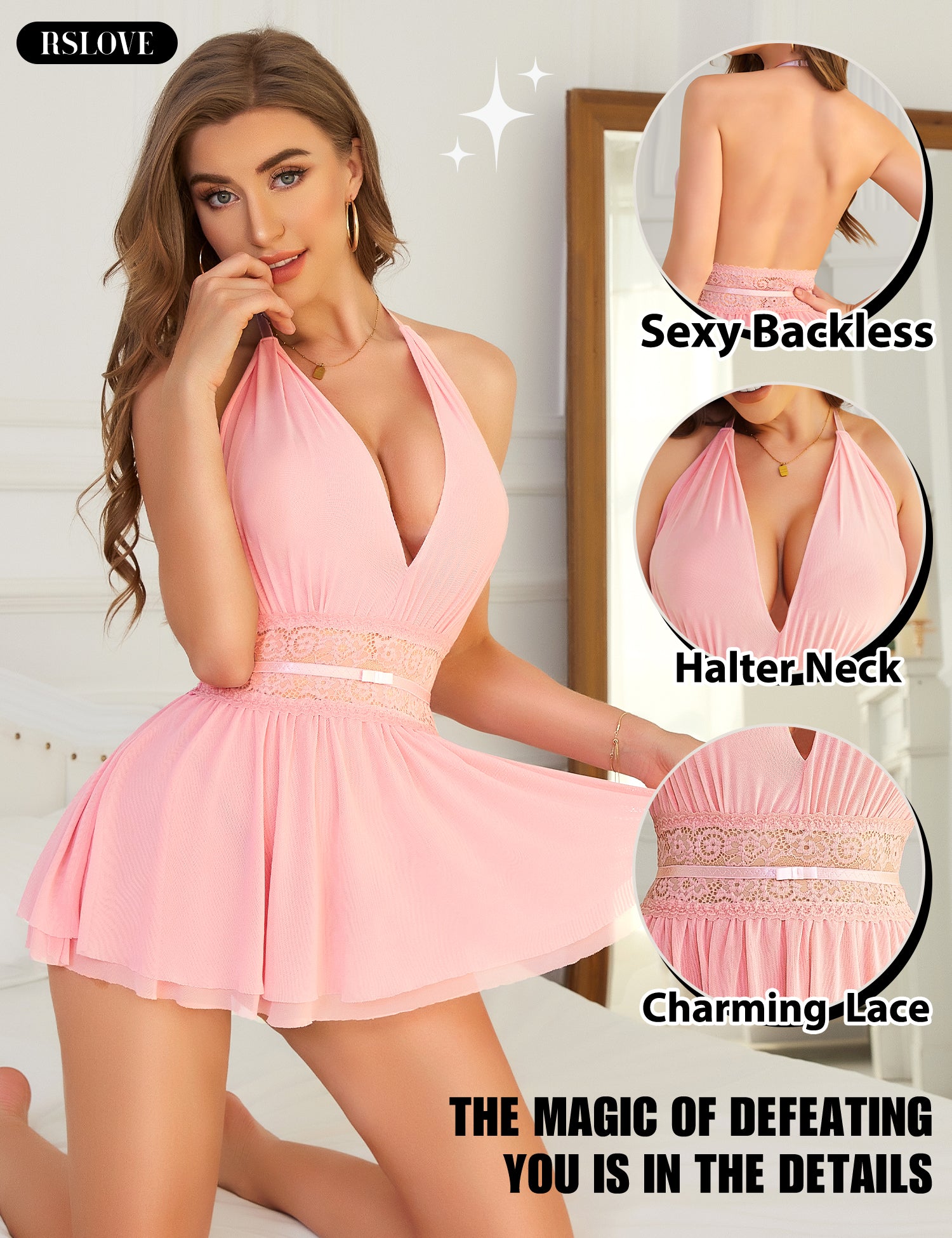 RSLOVE Women's Lingerie Lace Babydoll - Sexy Chemise with Halter Neck Backless Mesh Nightgown Spaghetti Straps Sleepwear