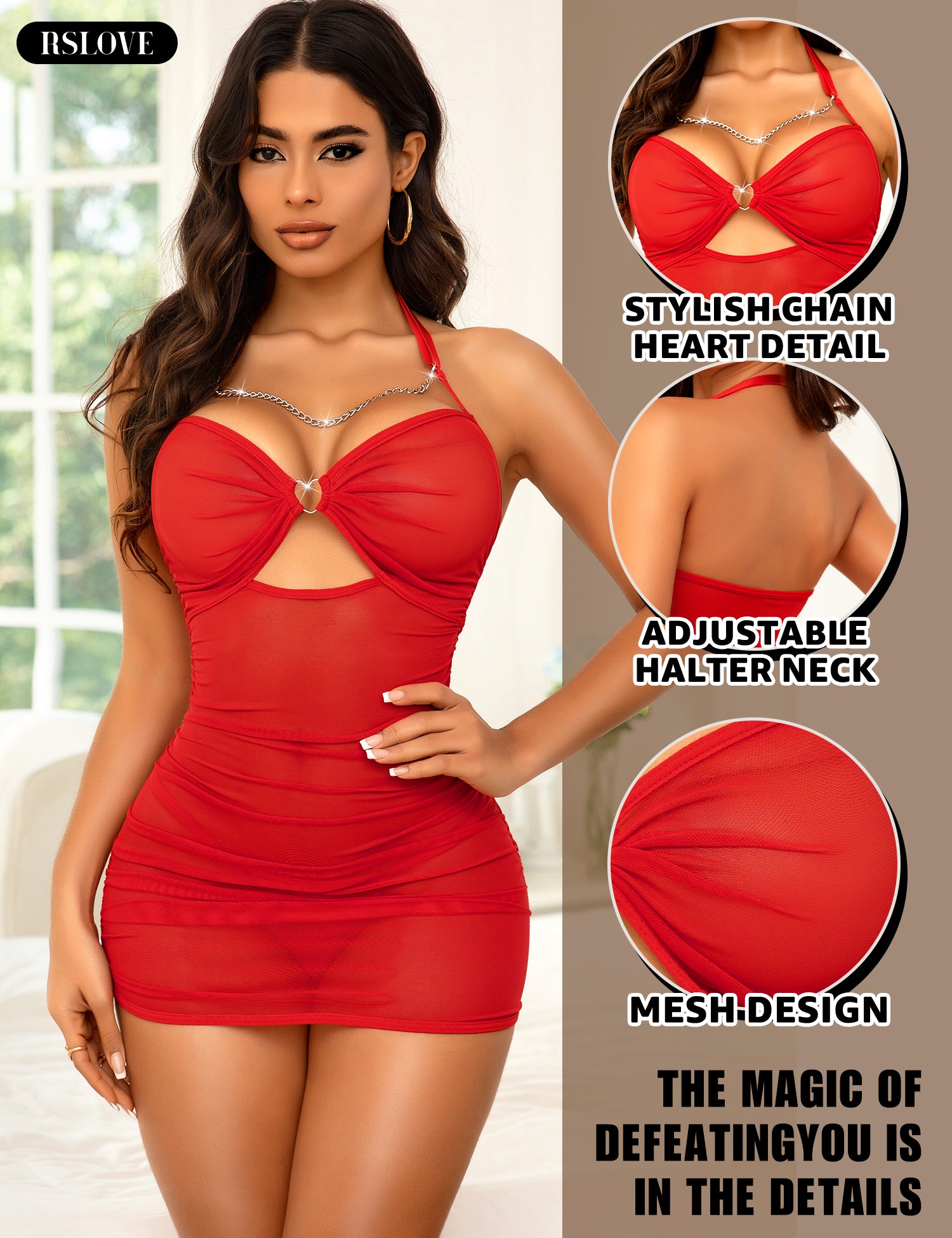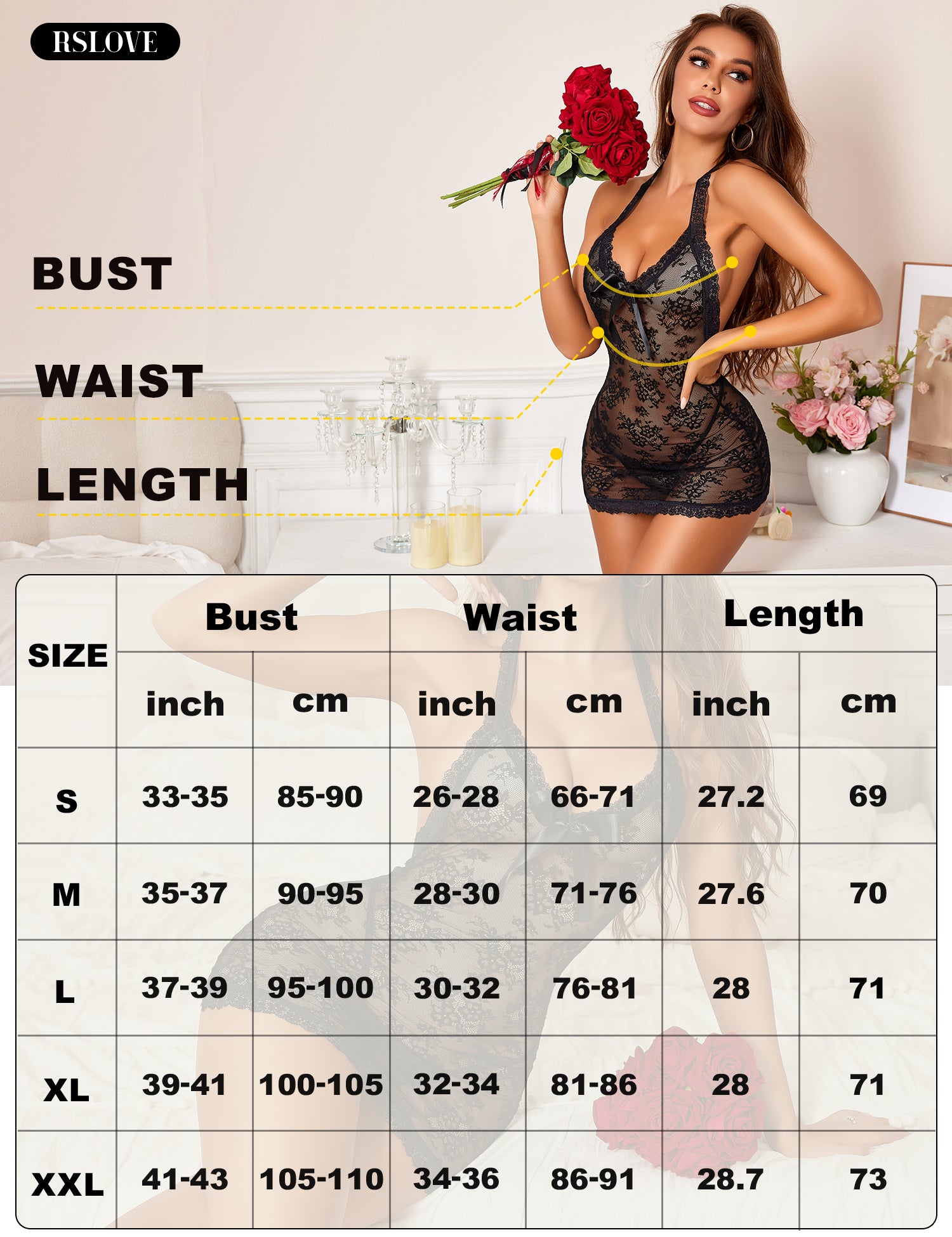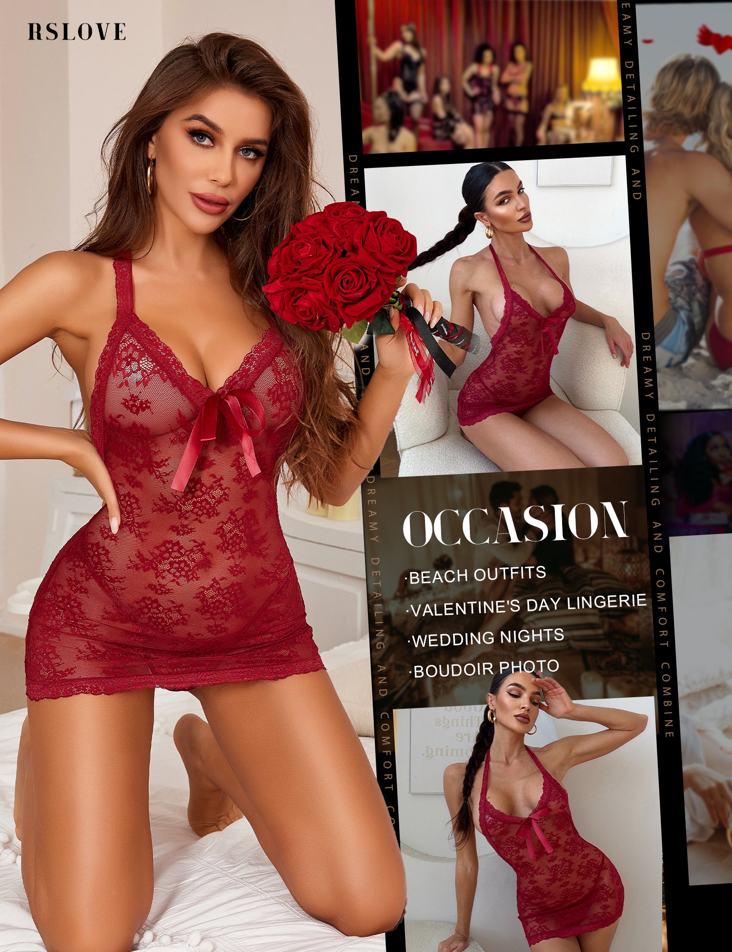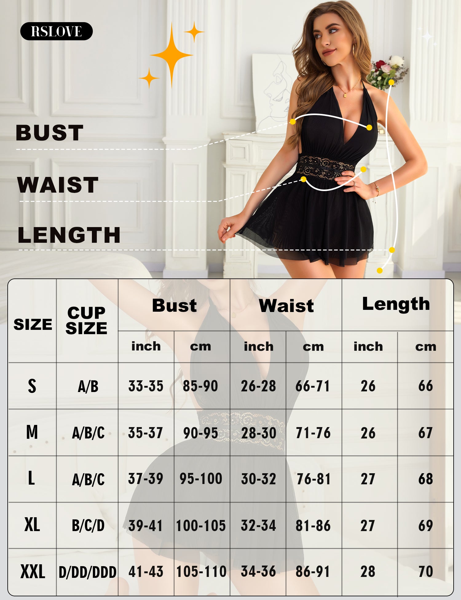 RSLOVE Women's Lingerie Lace Babydoll - Sexy Chemise with Halter Neck Backless Mesh Nightgown Spaghetti Straps Sleepwear