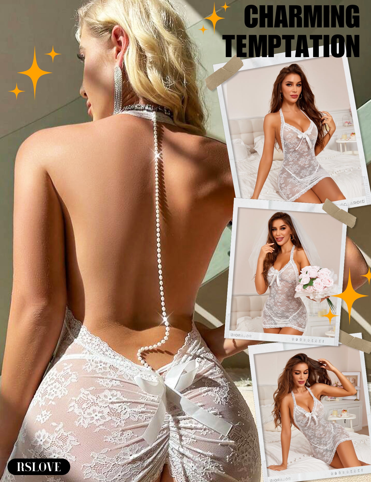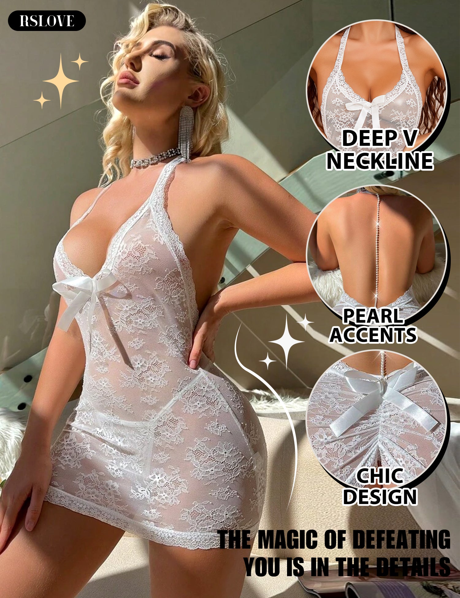 RSLOVE Women's Lingerie Lace Babydoll - Halter Mini Dress Sexy Nightgown with Bow and Pearl Accents for Special