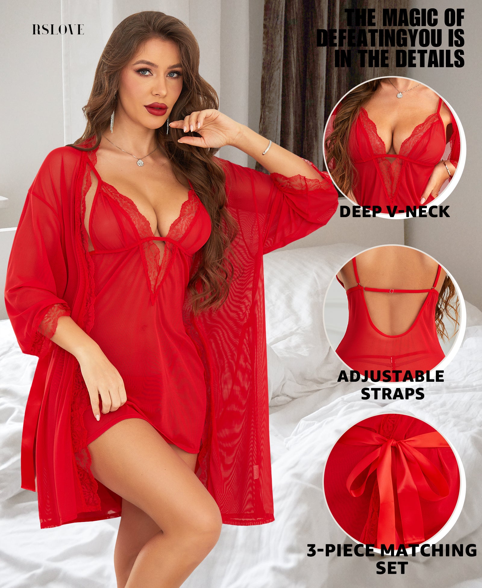RSLOVE Women Sexy Lingerie Set - 3pc Lace Mesh Babydoll with 3/4 Sleeve Robe & Panty Adjustable Strap Nightgown Sleepwear