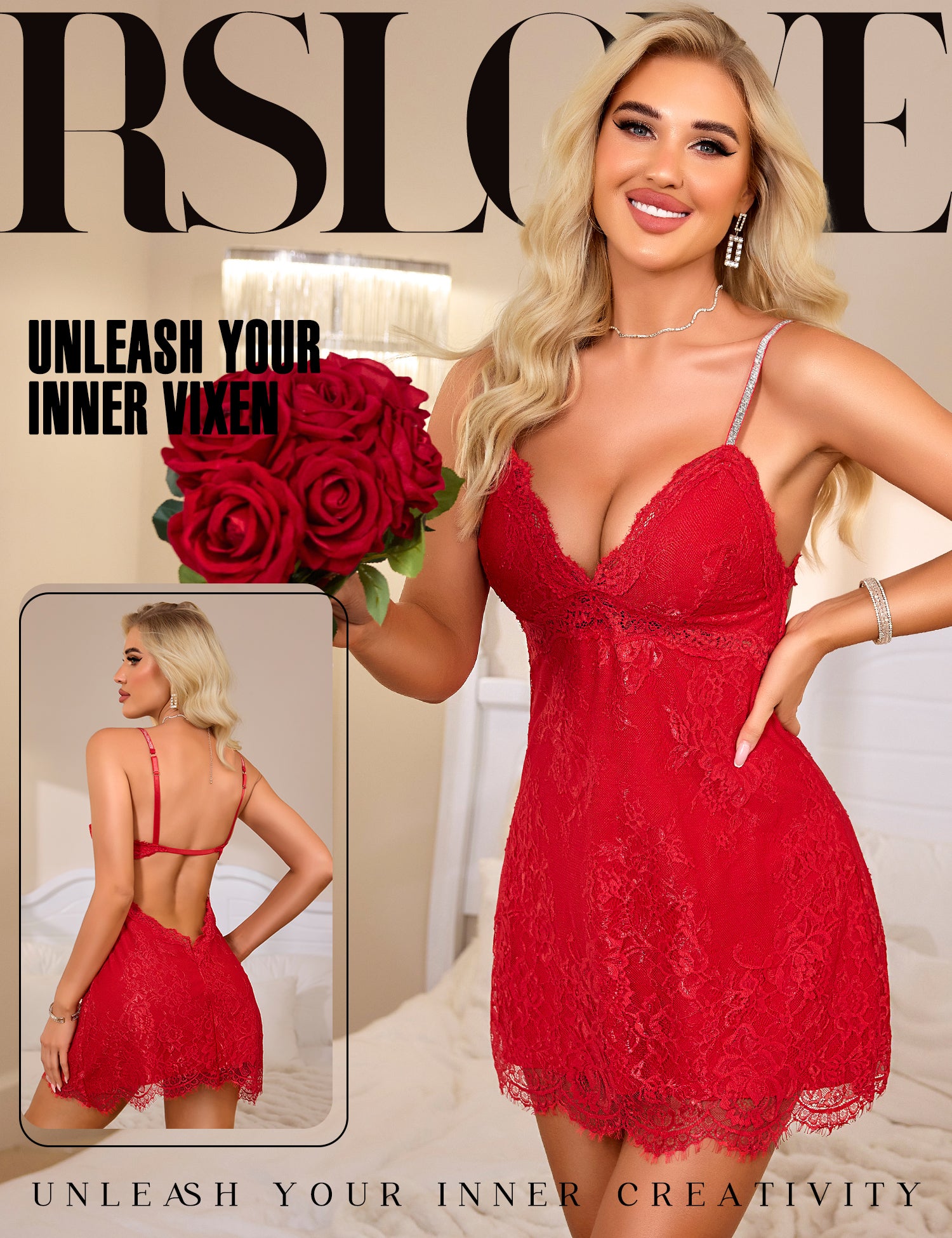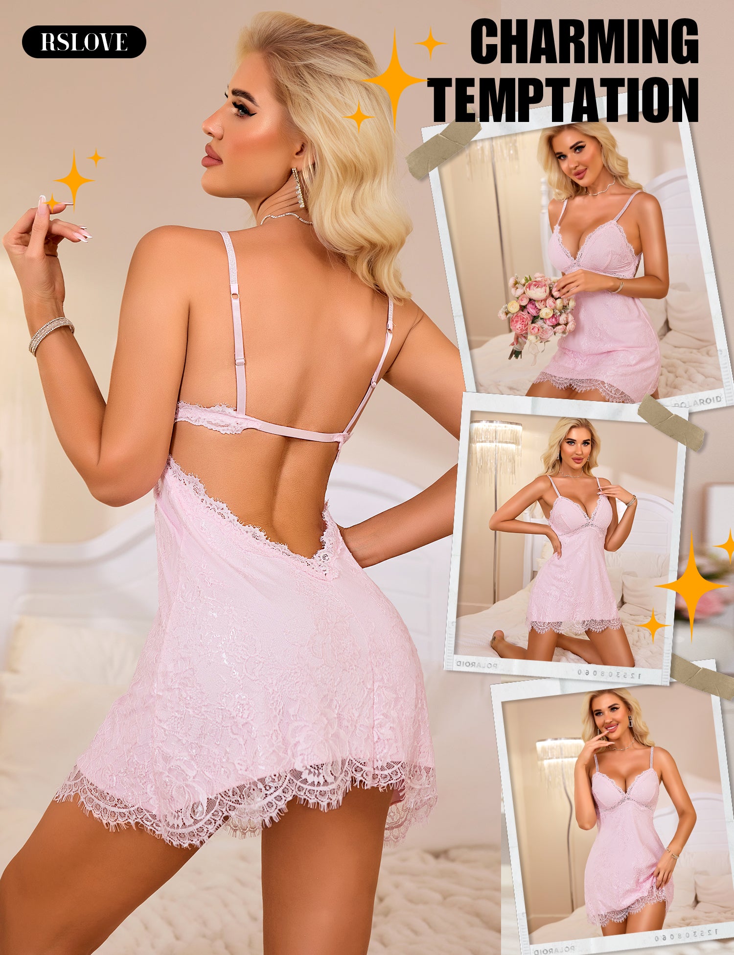 RSLOVE Womens Lingerie Lace Nightgown - Sexy Nightwear Spaghetti Strap Sleepwear Babydoll Chemise V Neck Soft Sleepshirt