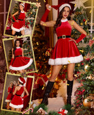 RSLOVE Christmas Costumes for Women - Velvet Halter Neck Santa Dress 4PCS Holiday Outfits with Belt Long Gloves
