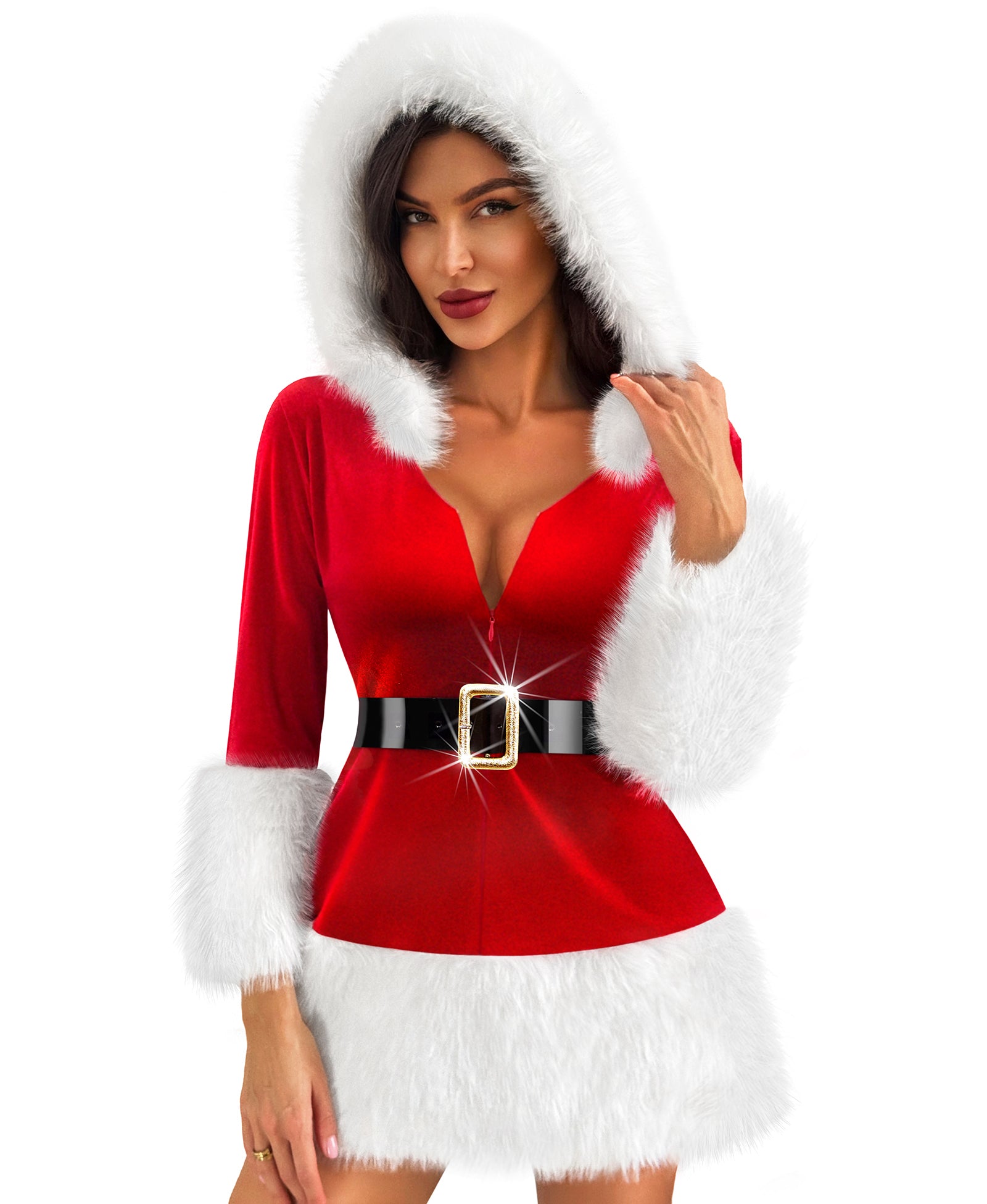 - Irresistible Christmas Charm: Step into the holiday spotlight with this captivating red santa dress, designed to make you the center of attention at every festive event. The daring deep V-neckline showcases your décolletage, while the luxurious faux fur hood adds a playful, yet seductive twist. Whether you're at a Christmas party or enjoying a cozy night by the fire, this stunning Christmas outfit will have you turning heads and feeling effortlessly glamorous.