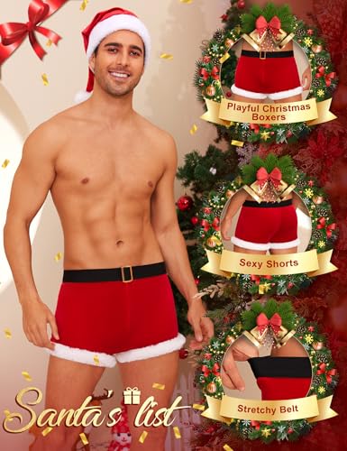 Details: Description RSLOVE Santa Mens Boxer Lingerie - Christmas Gifts Men Red Briefs Holiday Shorts for Adult Underwear Outfits 2PCS With Hat Perfect Gift Idea: Looking for a unique Christmas gift for your partner? This fun and flirty Santa outfit is an excellent choice for a romantic holiday surprise. It’s a great way to celebrate the season together with some festive flair Festive Red Cheer: These vibrant red Christmas boxers are the perfect way to celebrate the holiday season. The cheerful color of the fun boxers instantly brings festive spirit, making them an ideal choice for gifting or wearing to a Christmas party. Adorable White Fur Trim: The playful white fur trim along the legs adds a charming touch to the sexy briefs, enhancing their festive appeal. This unique detail makes the christmas shorts perfect for costume parties and ensures you look cute and cozy during holiday festivities. Comfortable and Snug Fit: Designed for a snug fit, these mens boxer briefs provide a stylish and flattering look. The soft fabric hugs your body comfortably, making the mens sexy underwear perfect for Christmas morning surprises or lounging during festive Xmas photoshoots. Complete the Look with a Christmas Hat: The matching Christmas hat adds an extra layer of fun to your outfit, making the santa costume for men perfect for holiday parties or family gatherings. This playful accessory brings the whole look together for festive cheer. Versatile Holiday Wear: Whether you're snuggling up by the fire or joining in on a Christmas party, these red boxers are a versatile choice. They make a fun gift for loved ones or a delightful addition to your holiday wardrobe, ensuring festive joy all season long!