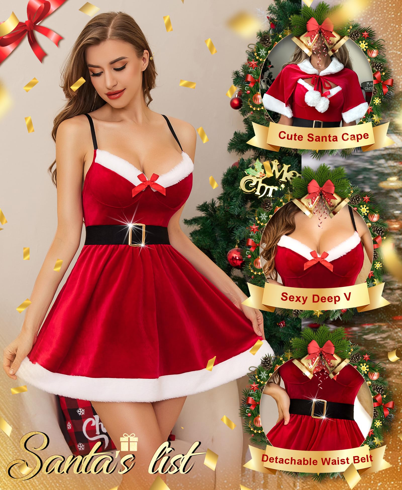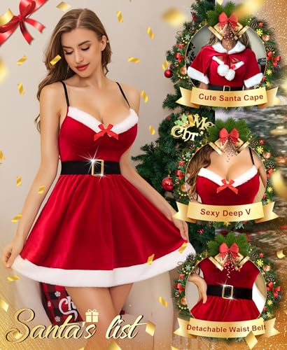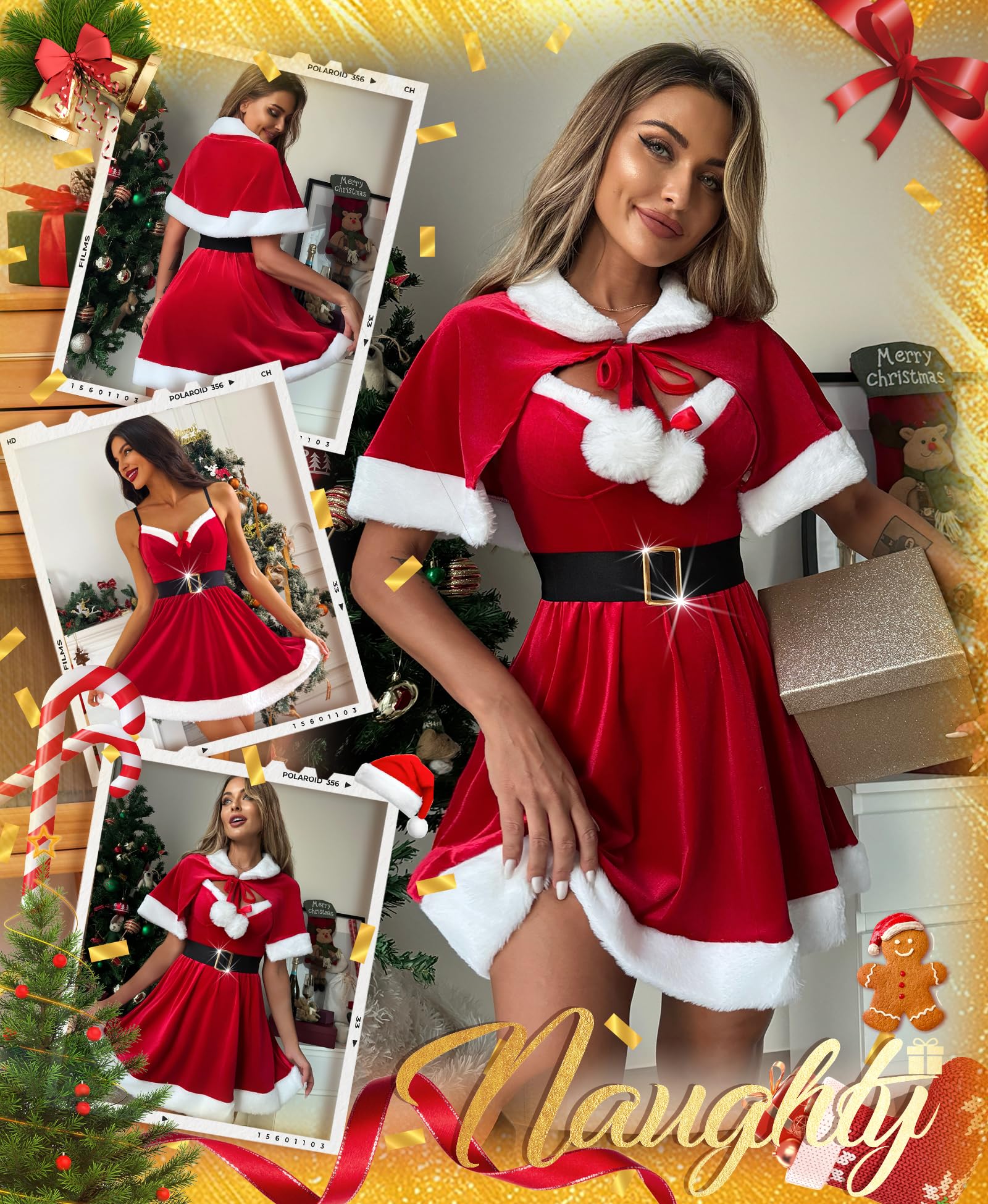 - Shining Christmas: Vibrant red, sexy Christmas outfits for women in a 3-pcs set. This hottest style pom-pom tie shawl cape features a soft, warm fur collar. Two fur ties add a playful and cute touch. It's easy to put on and take off and can effortlessly match any of your Christmas dress. The detachable waist belt helps outline charming curves. This Santa Claus costume switches effortlessly between elegant, sweet, and sexy seductive, making it the perfect secret weapon to ignite Christmas night