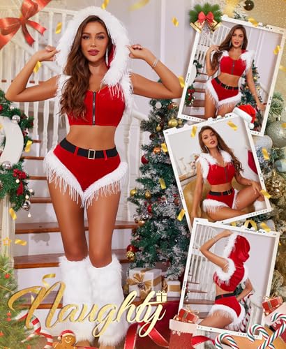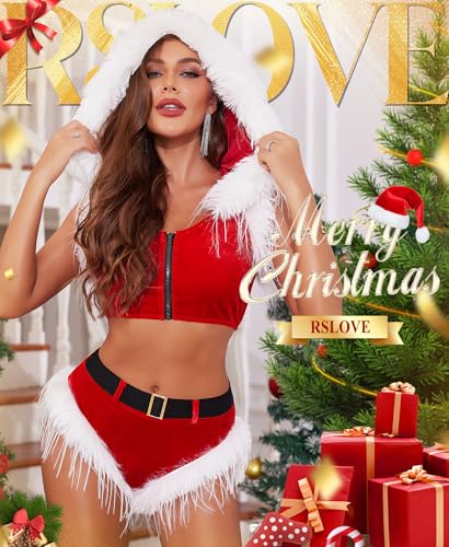Details: Description RSLOVE Christmas Outfits for Women Lingerie - Sexy Santa Costume Velvet Christmas Set 2Pcs Tops and Shorts Xmas Holiday Gifts with Belt Great design, a must-have item for the perfect gift under the tree! Christmas details: Get ready to captivate and dazzle this holiday season with this luxurious velvet Christmas lingerie set. Whether you're planning a romantic surprise or a festive night out, this set offers the perfect blend of style, comfort, and holiday cheer. It’s more than just an outfit; it’s the ultimate festive indulgence that will make you feel as stunning as ever! This two-piece velvet Christmas costume features a rich red velvet top adorned with soft white faux fur trimming, creating an irresistibly festive look. The hooded design with shoulder-length sleeves adds a cozy, playful twist that makes it perfect for keeping the holiday vibes alive. The front zipper closure offers both convenience and a sultry appeal, allowing you to adjust your look with ease. Whether you're cozying up for a Christmas movie night or attending a holiday party, this set will have you shining all season long. Black belt outlines your waistline, become a Christmas night ""leprechaun"" easily.The cap sleeves provide added flexibility and a touch of fashion, ensuring you feel both at ease and stylish during the holiday season. Occasion: The Naughty Santa babydoll is perfect for Christmas shoots, Christmas night, Santa's lingerie night, Valentine's Day, anniversaries, honeymoons, lingerie parties, or every hot night. This is your blooming charm helper that will leave you with everlasting memories.
