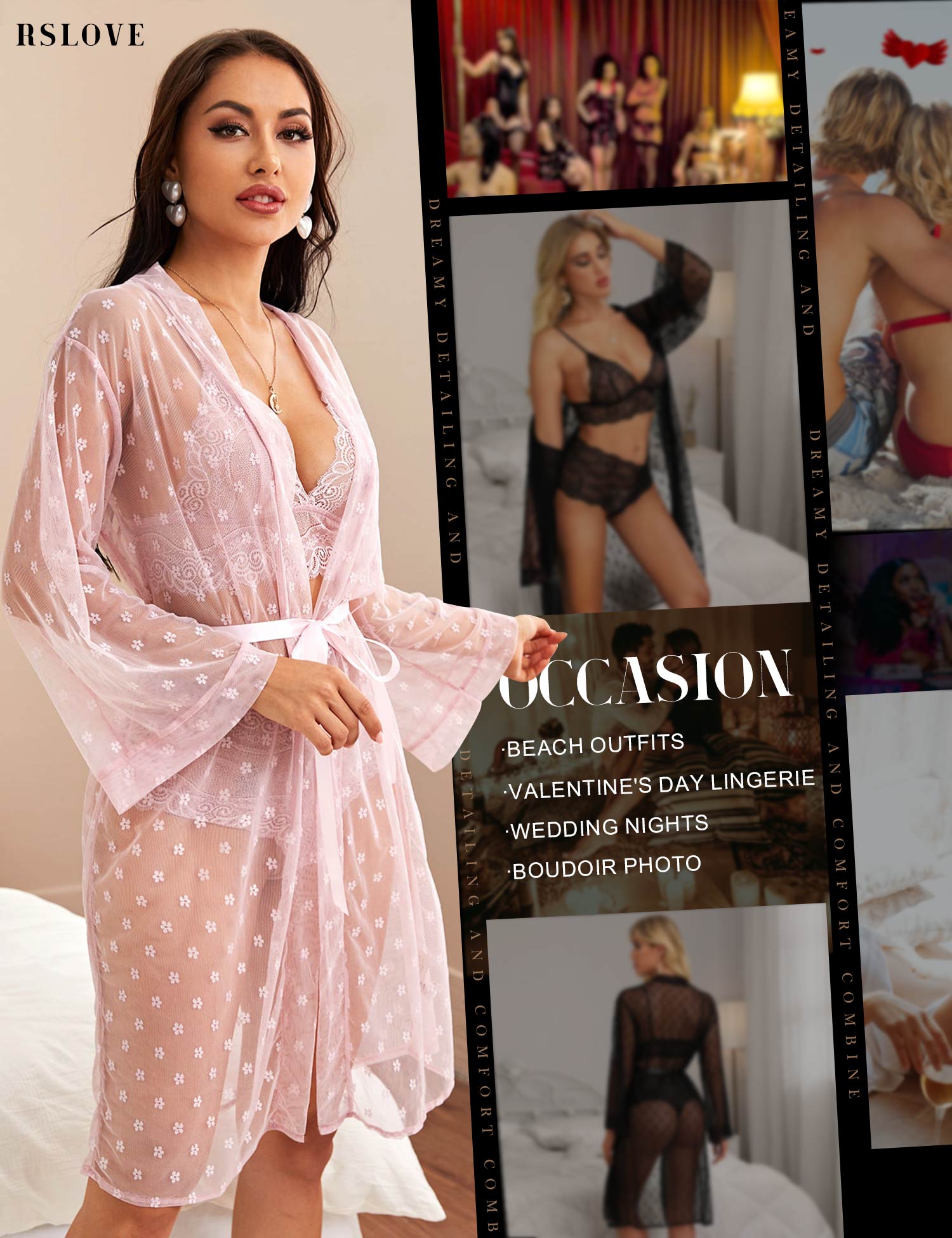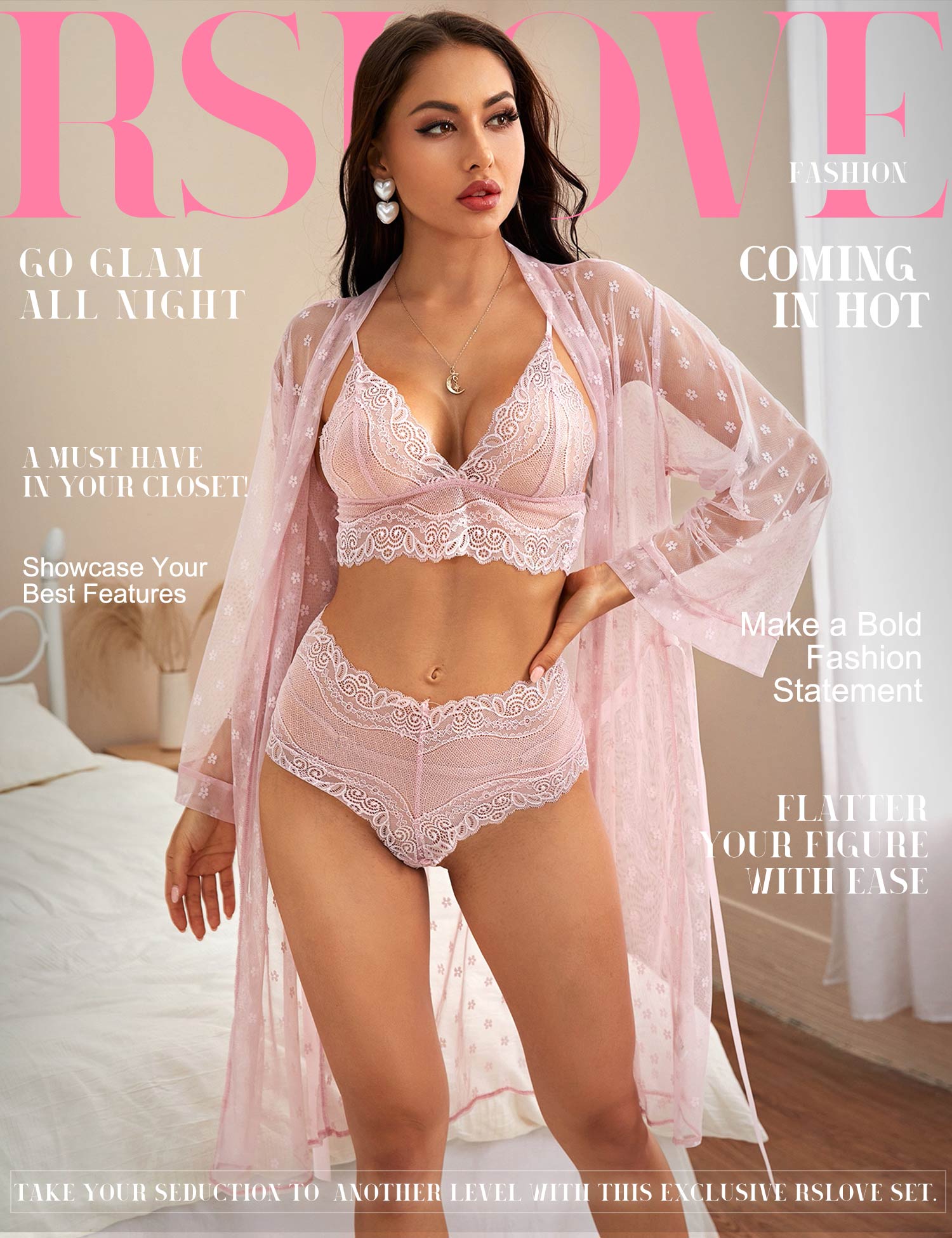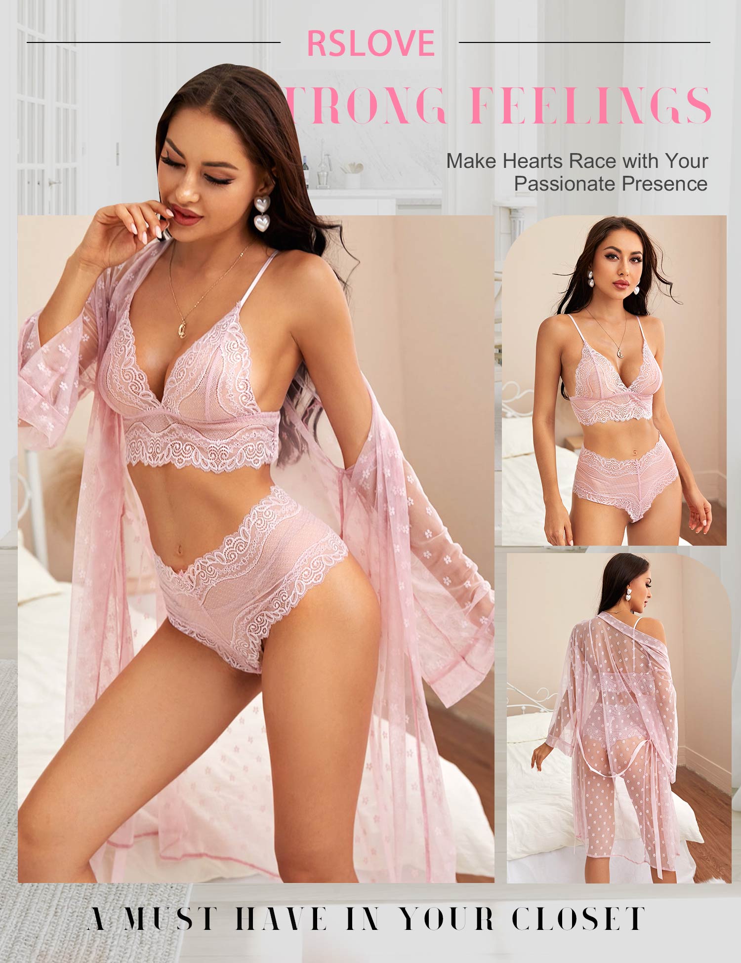 RSLOVE Women Sexy Lingerie Set 3 Piece Lace Kimono Robe with Bra and Panty Sheer Sleepwear