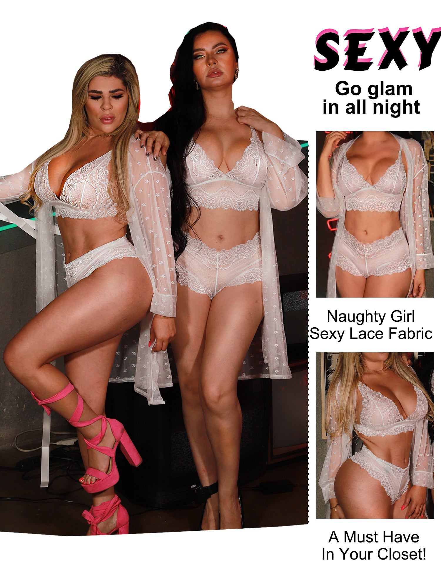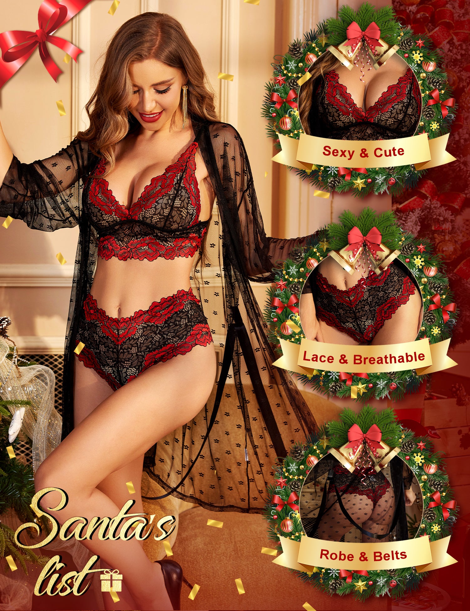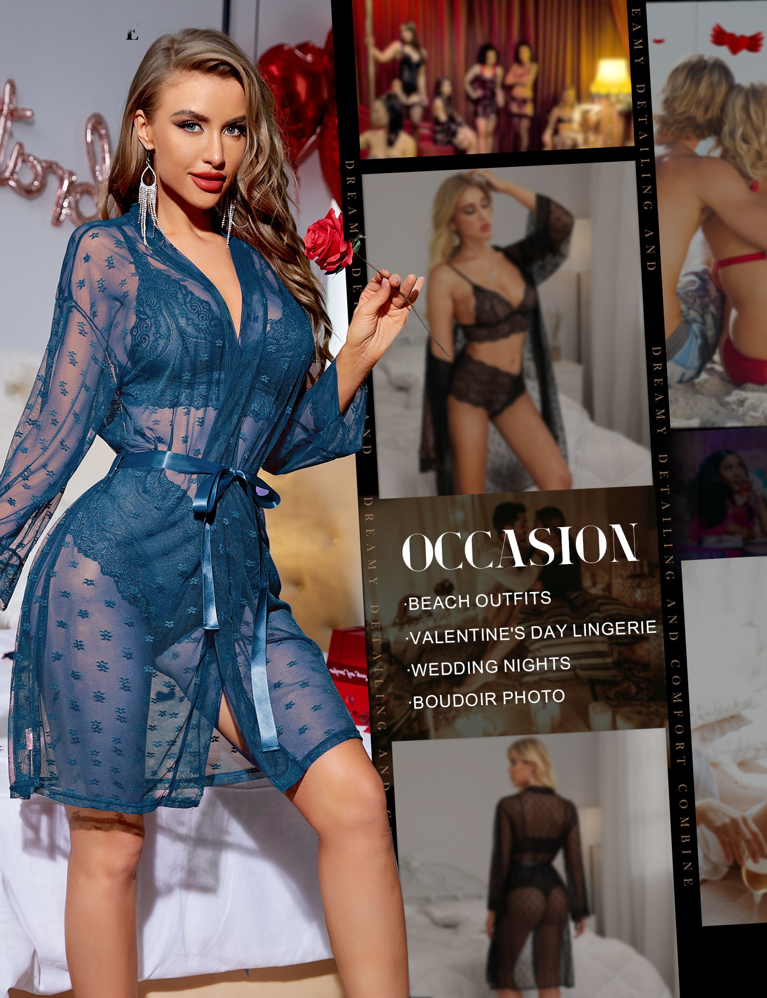RSLOVE Women Sexy Lingerie Set 3 Piece Lace Kimono Robe with Bra and Panty Sheer Sleepwear