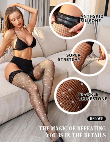 RSLOVE Fishnet Stockings Rhinestone High Waist Tights Pantyhose Women's Sexy
