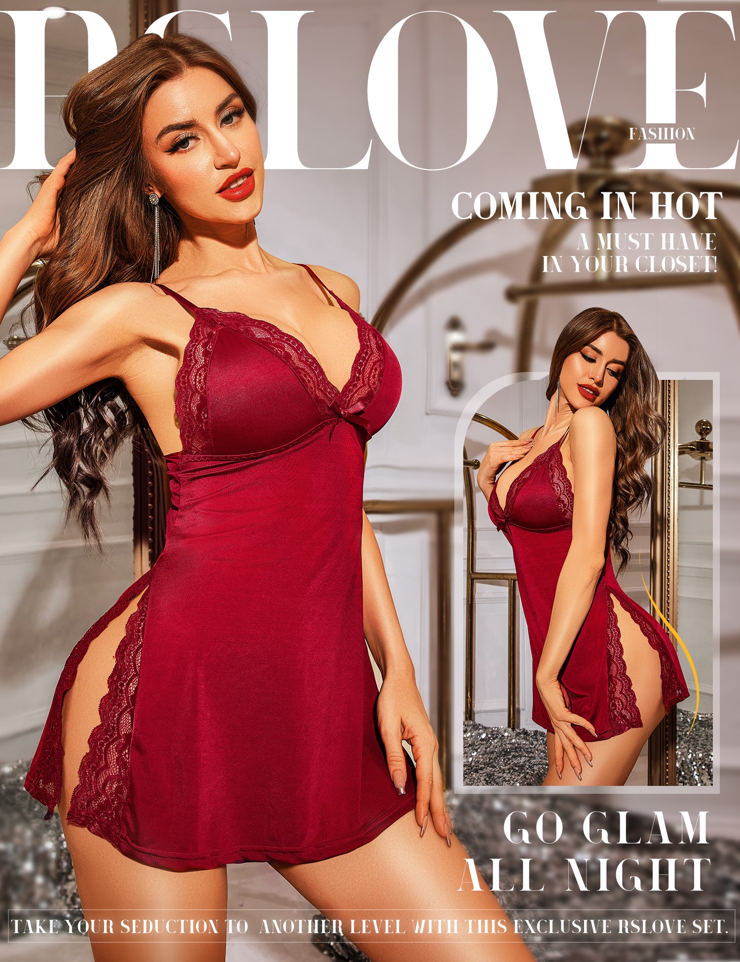 RSLOVE Women's Lingerie Sexy Nightgown Lace Babydoll Deep V Chemise Side Slit Nightie Sleepwear