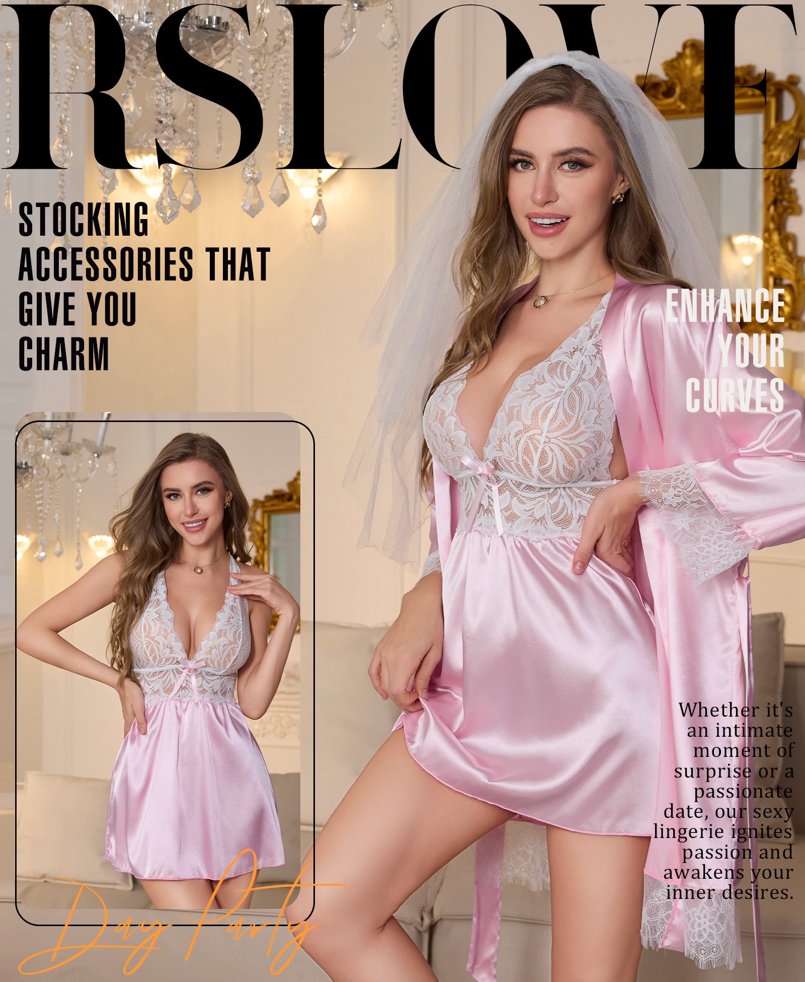 RSLOVE Women’s Satin Lace Lingerie Set – 2-Piece Babydoll Nightgown & Kimono Robe, Sexy Strap Chemise Bride Comfy Sleepwear