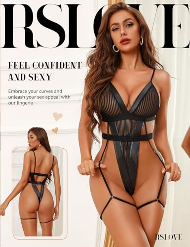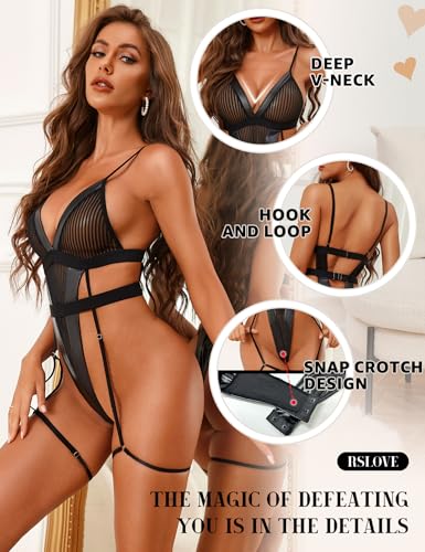RSLOVE Strappy Teddy Lingerie with Garter - Mesh Bodysuit