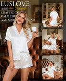 - Stylish Cropped Shirt: The short-sleeved button-up top adds a chic twist to classic womens pyjamas, offering a flattering cropped fit that enhances your silhouette. Designed with a notched collar and satin buttons for an extra touch of polish.