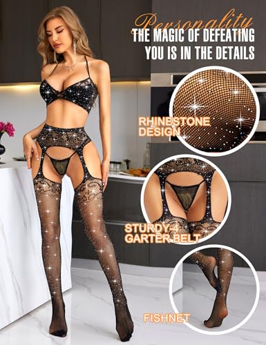 Details: RSLOVE Bodystocking Lingerie Sets for Women - Sexy Fishnet Garter Belt Stocking Womens Bra and Panty sets 3 Piece One Size Captivating Glamour: Unlike ordinary exotic lingerie, this lingerie set is adorned with sparkling rhinestones that shimmer alluringly under the light, emanating an aura of refined elegance. The exquisite crystal embellishments undoubtedly make this a top pick for fashion-forward women seeking high-quality, stylish pieces. Halter Design: The halter-style bustier in this garter belt lingerie set is designed to flatter and enhance the bust line in incredibly alluring ways. The halter neckline creates a sultry, eye-catching silhouette that draws attention to the décolletage area. This strategic cut also provides excellent lift and support, helping to accentuate the natural curves of the bust for a stunning, confidence-boosting look. Captivating Suspender Pantyhose :The suspender straps running along the thighs create a visually elongating effect, making your legs appear longer, leaner, and more statuesque. This flattering silhouette is incredibly enticing. Whether you're looking to treat yourself or surprise a special someone, the suspender pantyhose in this lingerie set are sure to make you feel utterly captivating from head to toe. Effortless Fit: The stretch and flexibility of the one-size construction allows the pieces to mold comfortably to your unique curves for a custom, tailored feel. No more struggling to find the "perfect" size. And the pieces move fluidly with your curves for total ease of movement. Package contents: 1* Halter bra, 1* Rhinestone suspender pantyhose and 1* bow G-string. Please be very careful and gentle while wear the lingerie set, avoid to nail and sharps.