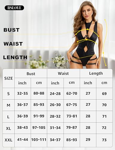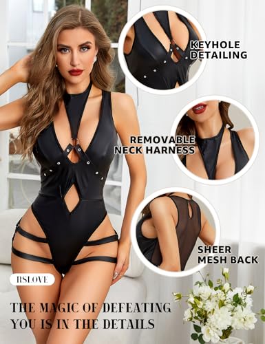 Details: Description RSLOVE Bodysuit Underwear lingerie made of high quality leather and polyester ensures an ultra-soft and comfortable experience for you. One piece women lingerie bodysuit with a removable high neck harness accessory with O-ring details, and a thong cut back, adjustbale straps perfectly to show off your curves. The teddy lingerie is easy to wear. Complete your seductive look with our removable harness accessory. Get a stunning cleavage with our Bandage Halter Teddy. Leather lingerie teddy perfect for a romantic night, special night, rave party, Valentine's Day, honeymoon gifts, wedding night, bridal gifts, Halloween, Christmas, boudoir shoot and every sweet night, makes you more attractive and charming. Package:1 Teddy Lingerie.