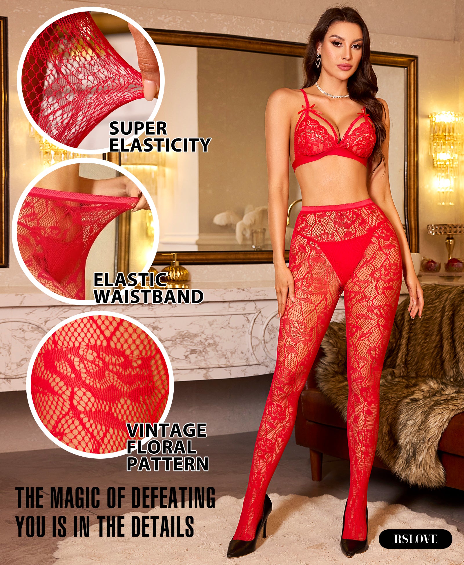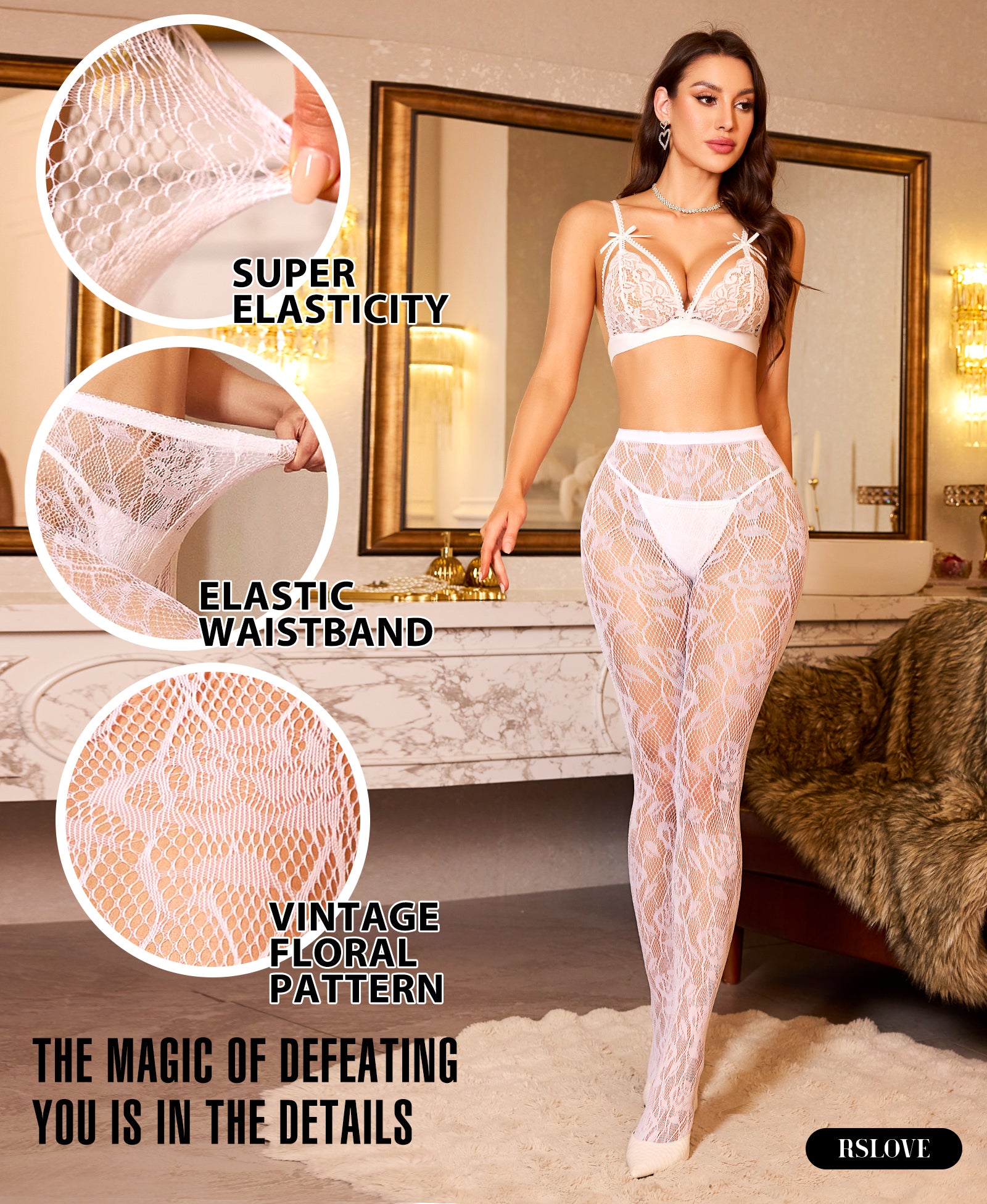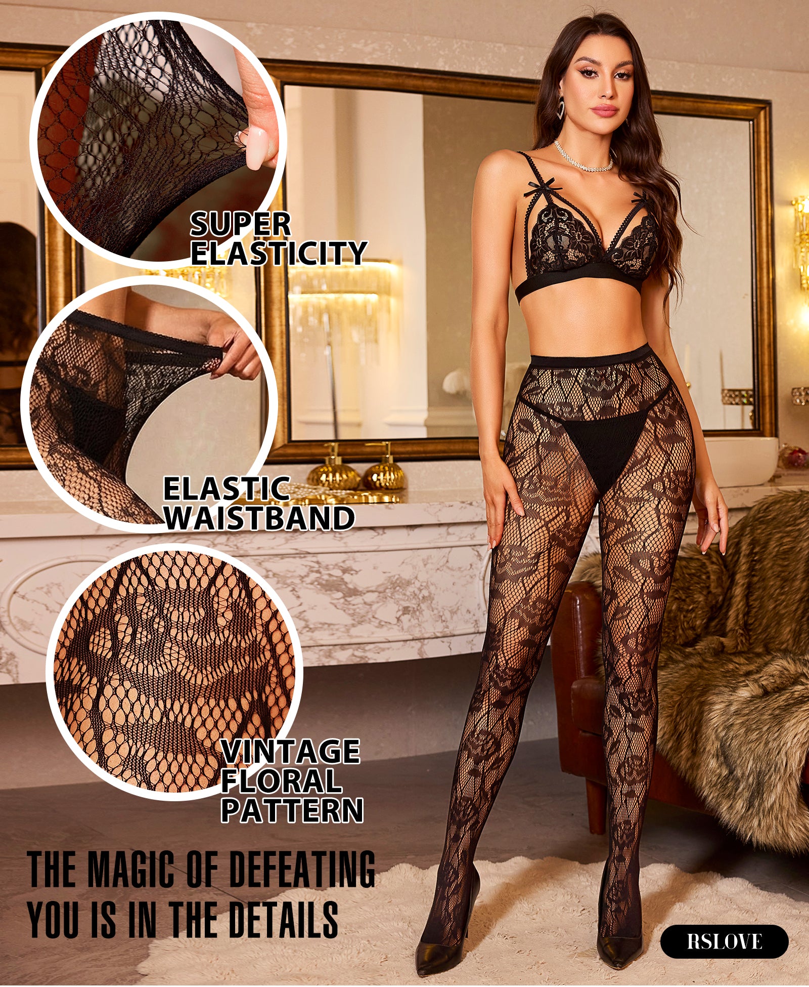 RSLOVE Women’s Patterned Fishnet Tights — Floral Lace Pantyhose Sexy Fashion Stockings One Size