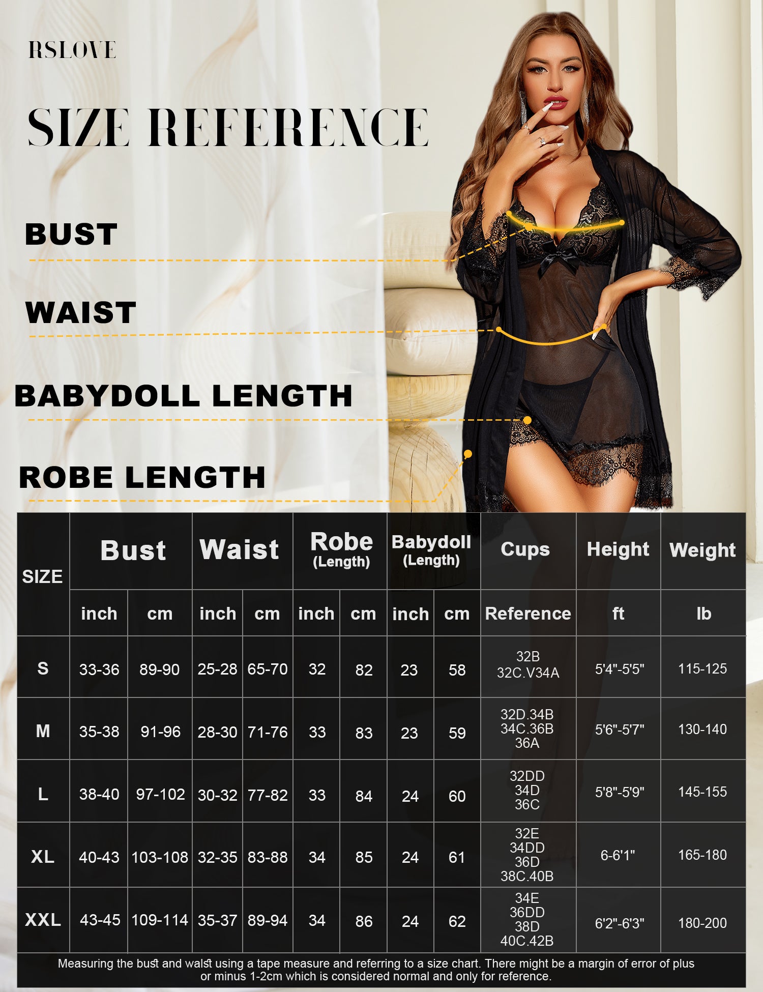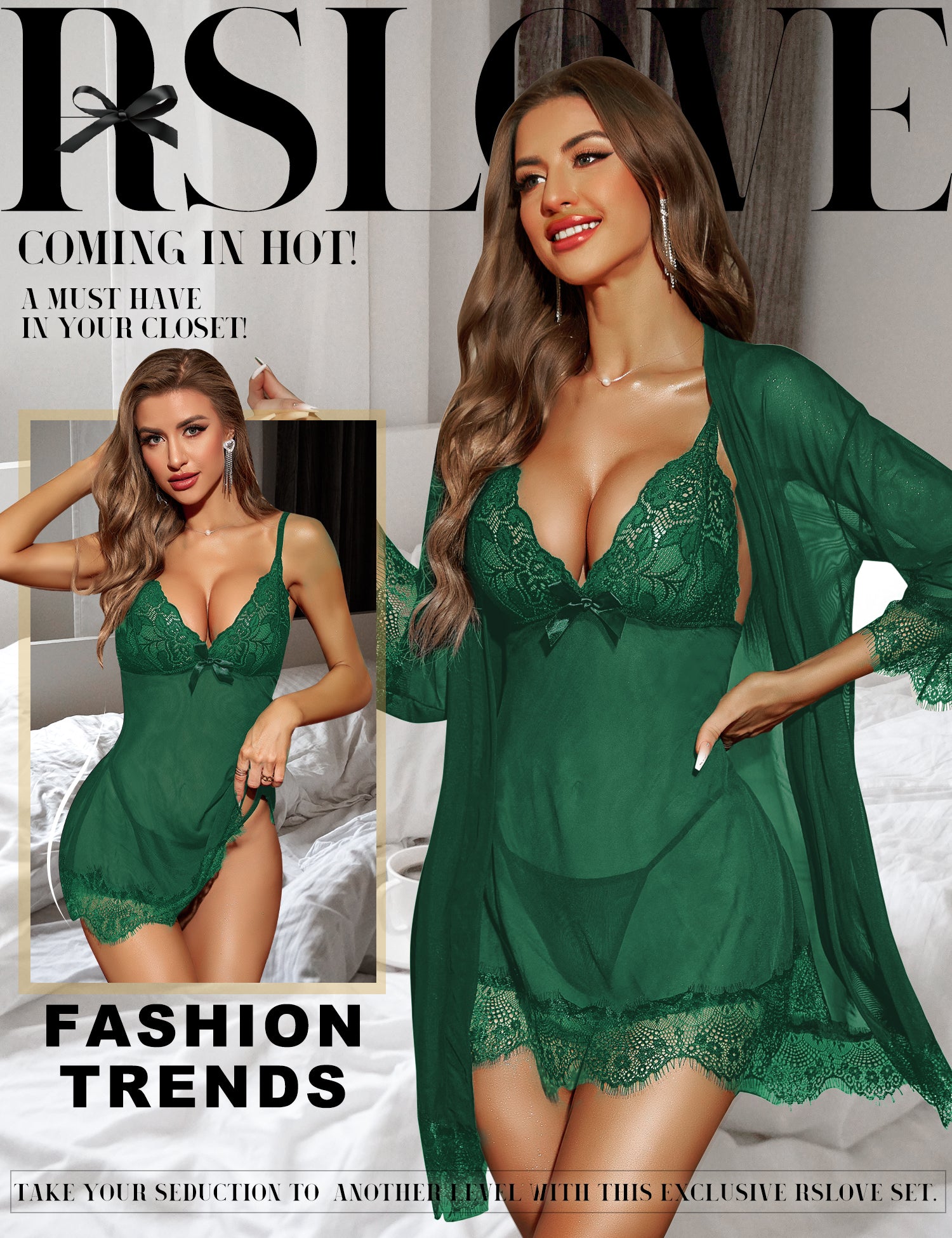- LUXURY 3-PIECE SET: This 3 piece lingerie sets consists of a sexy lace babydoll, mesh robe, and thong. The babydoll features a sexy deep V-neckline with bow accents and adjustable shoulder straps. The sexy robe is adorned with soft lace trim. It's the perfect blend of comfort and sexiness. Let's be elegant, sexy, and confident with RSLOVE luxury lingerie set