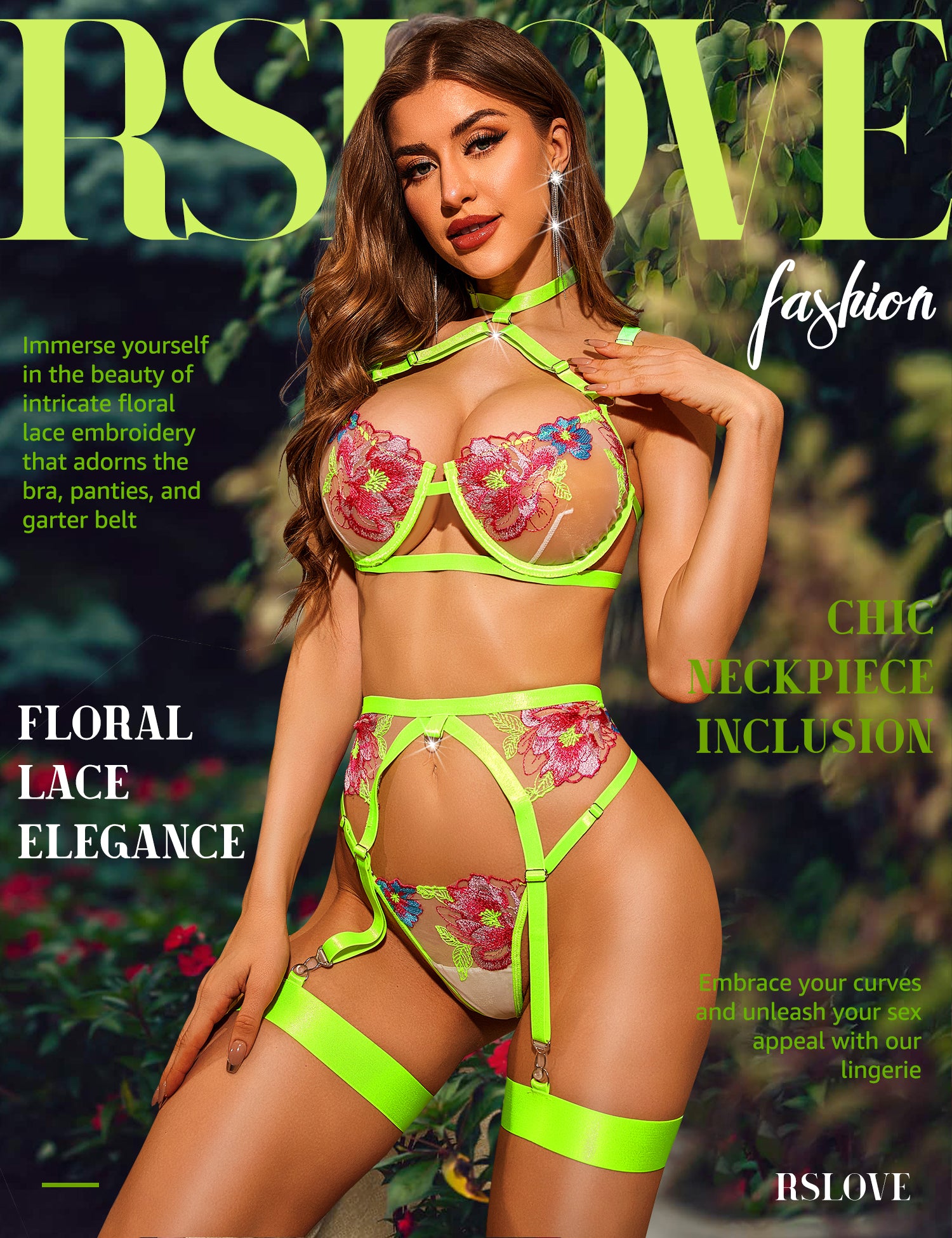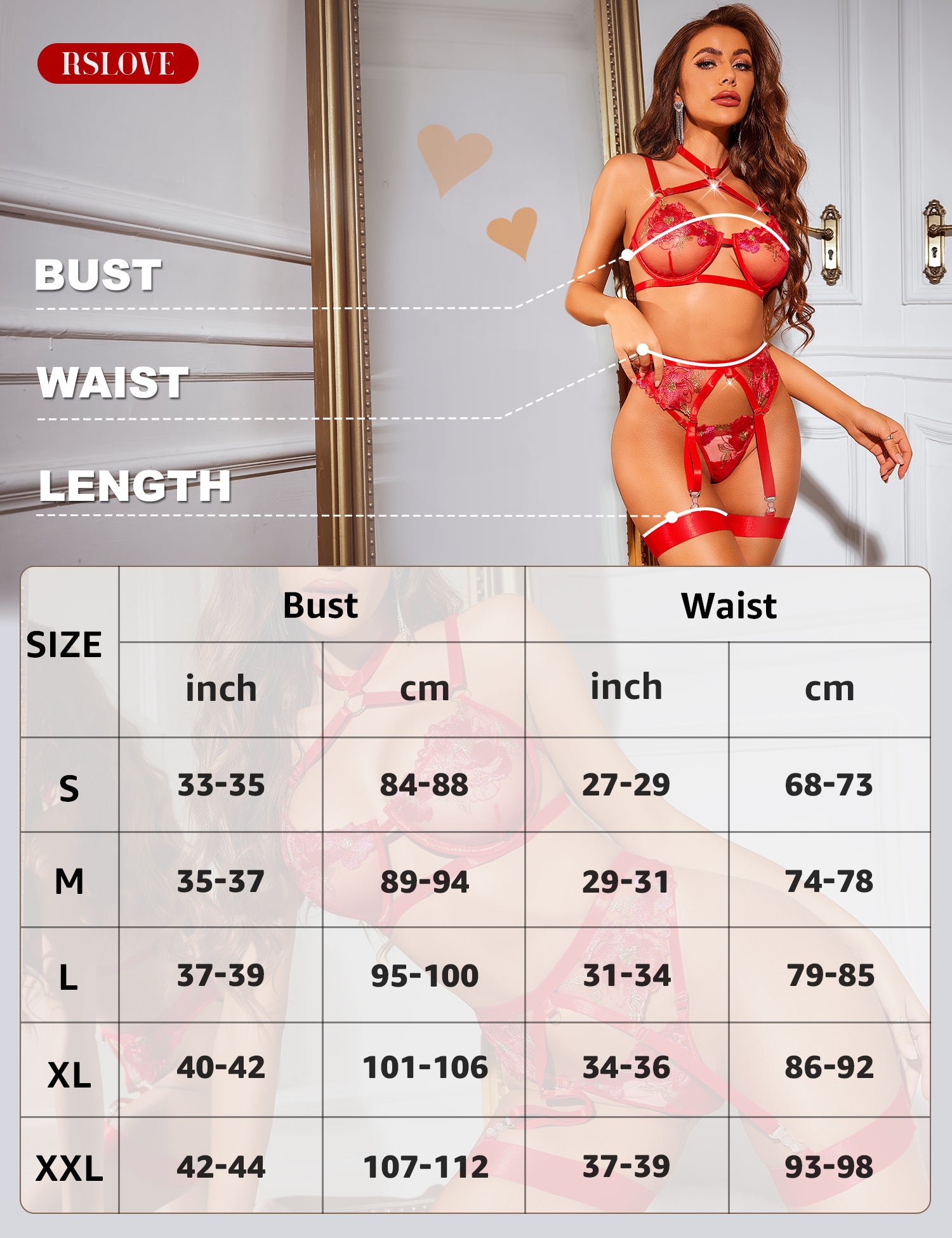 RSLOVE Women's Sexy Lingerie Set with Garter Belt Underwire Floral Embroidered 3 Piece Bra and Panty Sets Lace Babydoll